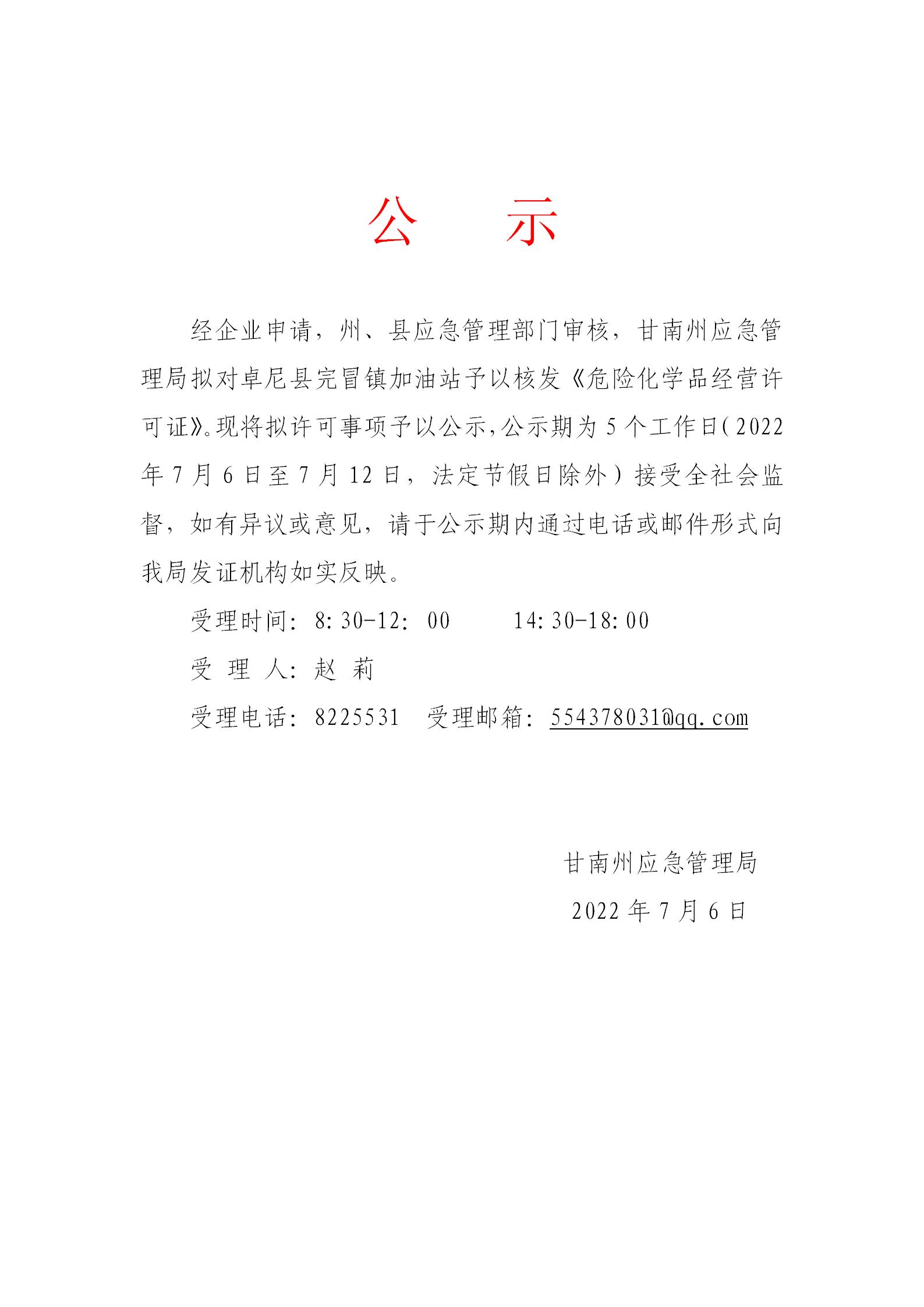 关于拟对卓尼县完冒镇加油站《危险化学品经营许可证》予以核发的公示