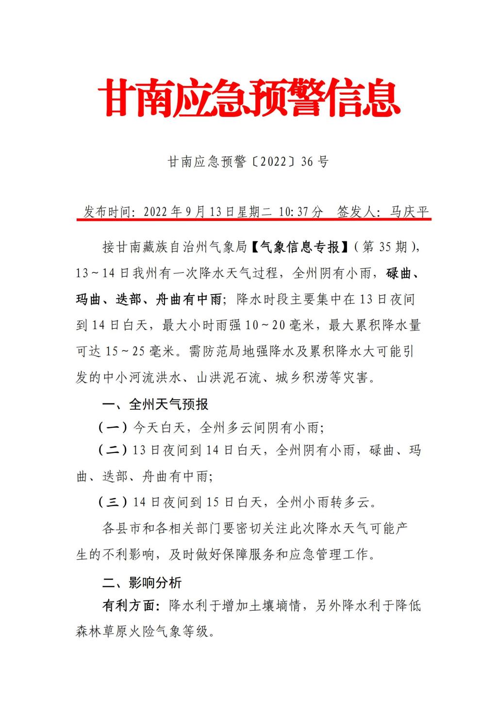 甘南应急预警信息 甘南应急预警〔2022〕36 号
