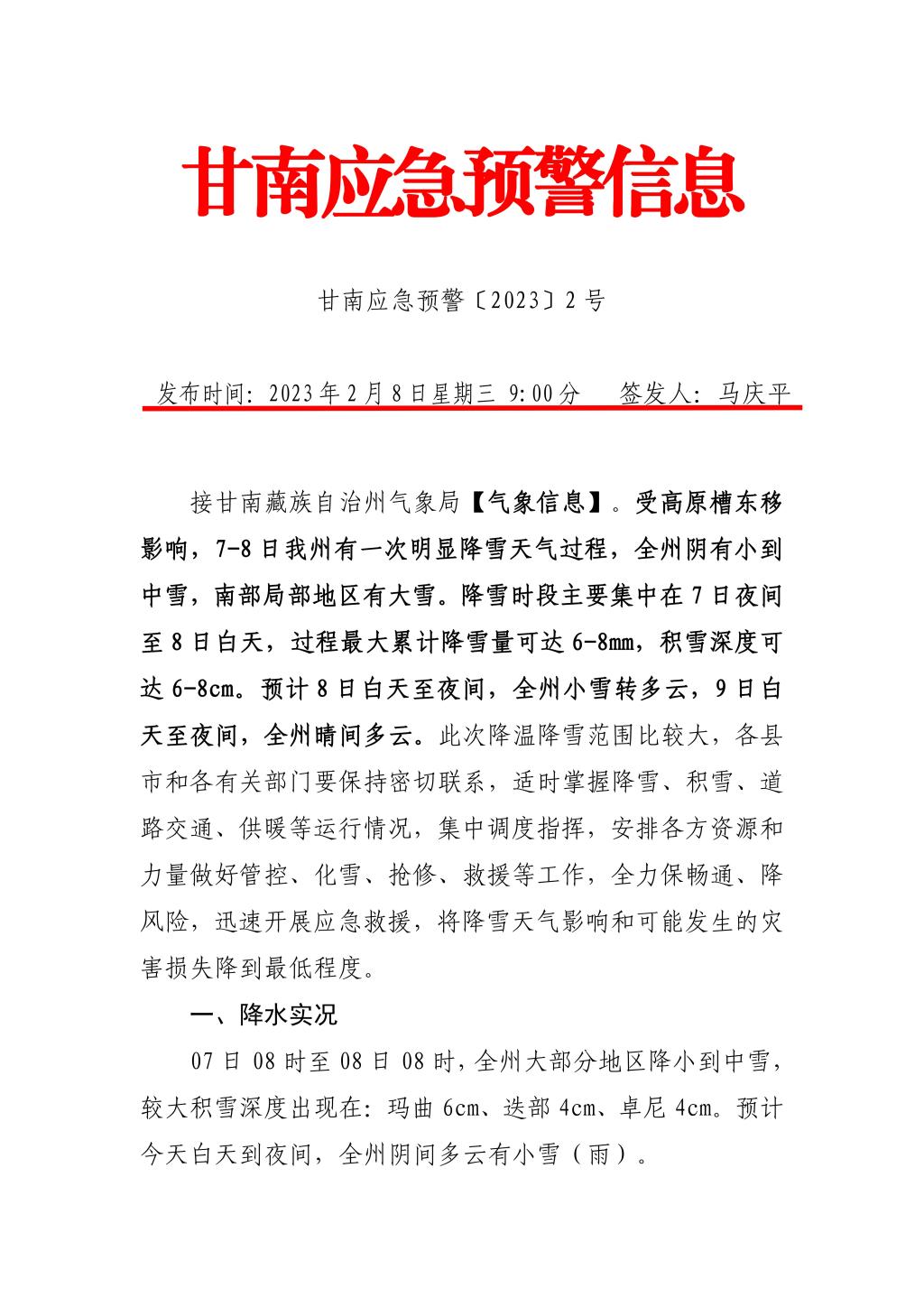 甘南应急预警信息 甘南应急预警〔2023〕2 号